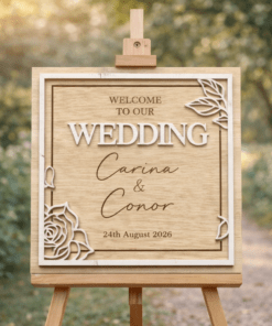 This beautifully layered wooden sign features a structured square design with a delicate botanical frame detail. The combination of raised lettering and refined floral corner accents creates a balanced and sophisticated look, perfect for both classic and modern wedding themes.