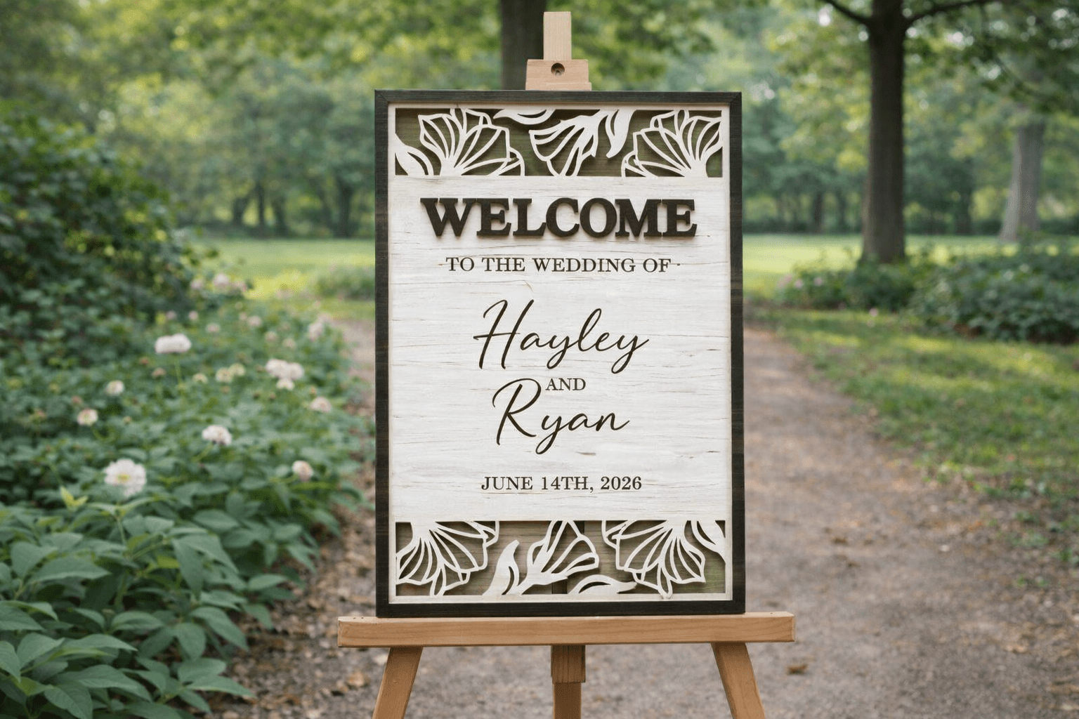 This beautifully crafted wooden sign features a full dark frame with intricate layered botanical detailing at the top and bottom. The combination of raised lettering, clean typography and delicate leaf accents creates a timeless and sophisticated look — perfect for classic, modern, or luxury wedding themes.