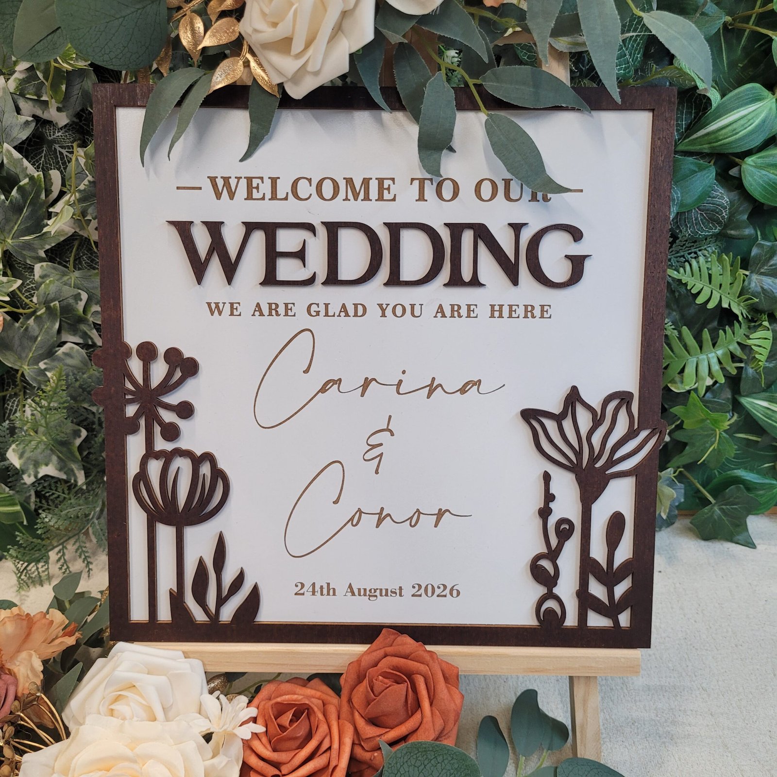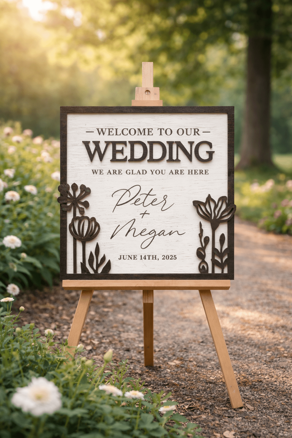 Featuring a bold full dark wooden frame and elegant layered floral detailing at the base, this handcrafted wooden sign adds warmth and character to your ceremony or reception entrance. The combination of raised lettering and botanical accents creates a stylish rustic-modern look, perfect for a wide range of wedding themes.